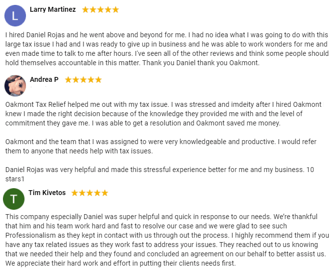 Estimates based on prior results; individual results will vary based on circumstances, including your ability to provide Oakmont Tax Relief with information that is accurate and timely. We do not guarantee that your tax debt will be lowered by a specific amount or percentage, that your tax debt will be paid off within a specific period of time or guarantee you will qualify for any IRS programs. Penalties and interest will continue to accrue until your tax liability is paid in full to the IRS. Oakmont Tax Relief is a tax resolution firm independent from the IRS. We do not assume tax debt , make monthly payments to creditors or provide tax, bankruptcy, accounting or legal advice. By providing your contact information, you expressly consent to receiving calls and/or SMS text messages at the number you provided as part of our service offerings, including but not limited to advertisements, solicitations, and service updates. The phone number belonging to the called/messaged person(s) could incur charges for such contact. Read and understand all program materials prior to enrollment. Not available in all states.